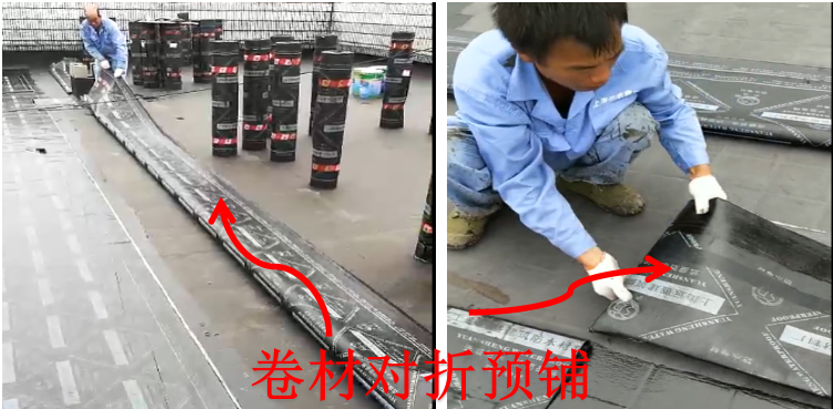 在處理(lǐ)好(hǎo)(hǎo)的基面上(shà事少ng),先将瀝青類卷材按鋪貼順序(注意:長邊搭接8cm,短邊搭接10cm高購)進行大面積預鋪,然後将每卷卷材對折翻揭覆鋪(如(rú)圖)。