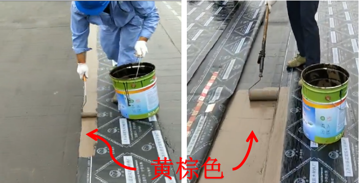 在上(shàng)述基礎上(shàng),将貼去習必粘開桶攪勻,對大面積基面采用滾筒将貼必粘在預鋪卷材的範圍内費低,把貼必粘滾塗在基面上(shàng),同鐵見時(shí)對卷材的長邊、短邊搭接部位也(yě)進行塗刷,要求均勻、無漏鄉文刷、不堆積(注:貼必粘剛開始塗刷時(shí)呈黃(huáng紅冷)棕色)。(如(rú)圖)